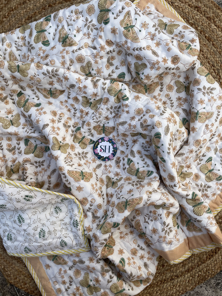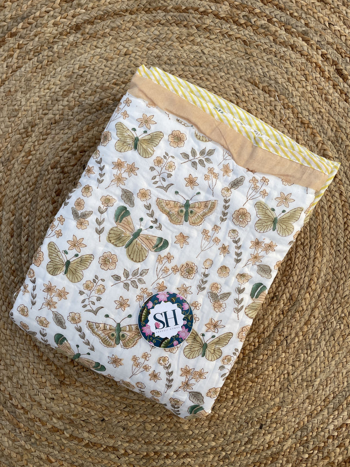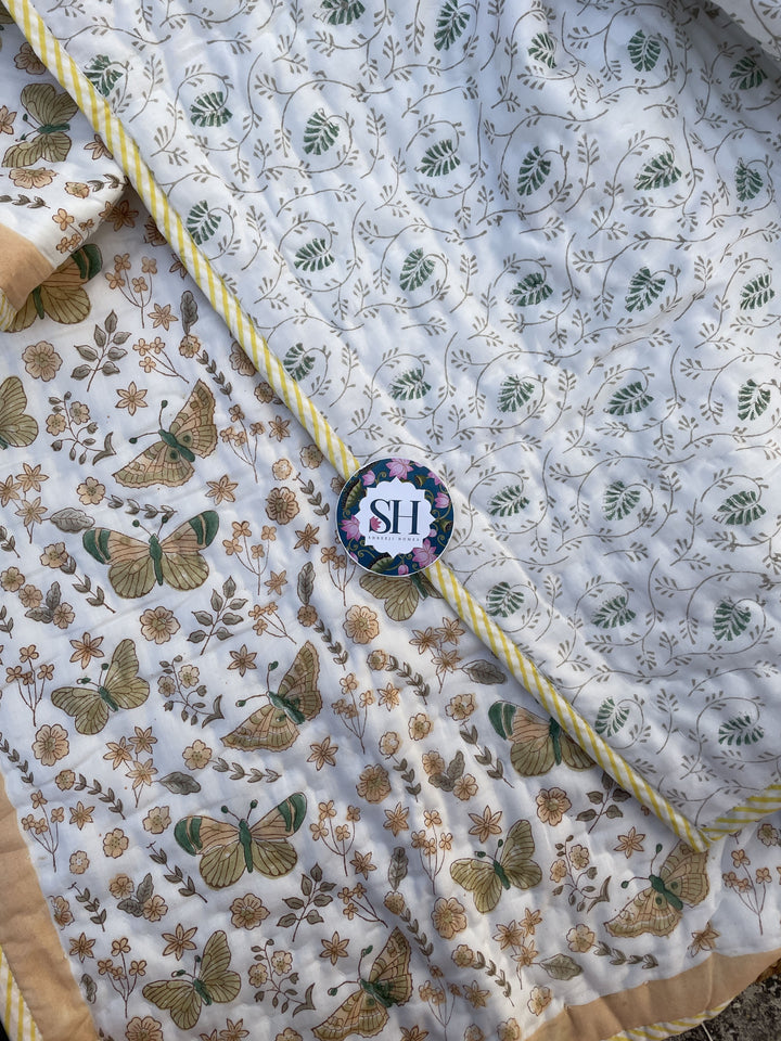 Reversible Hand Block Kids Print Comforter / Quilt Crafted by skilled artisans from Rajasthan, this cozy quilt features soft mulmul cotton filled between two quilted layers of pure cotton, providing both warmth...