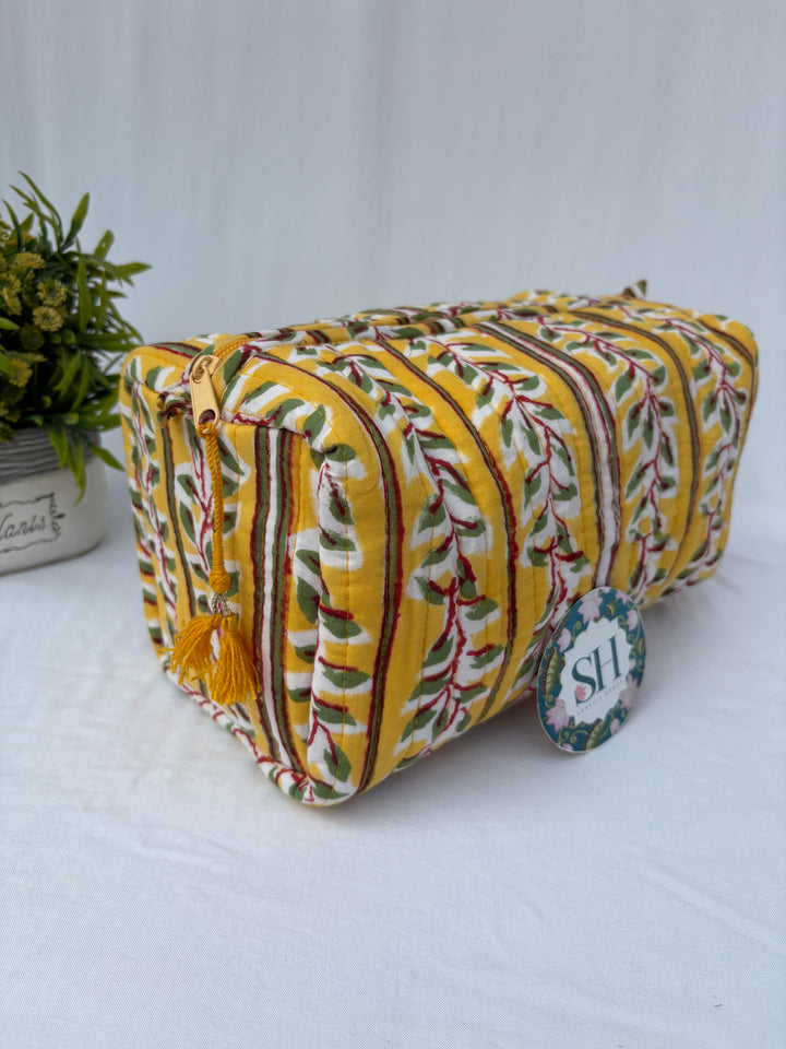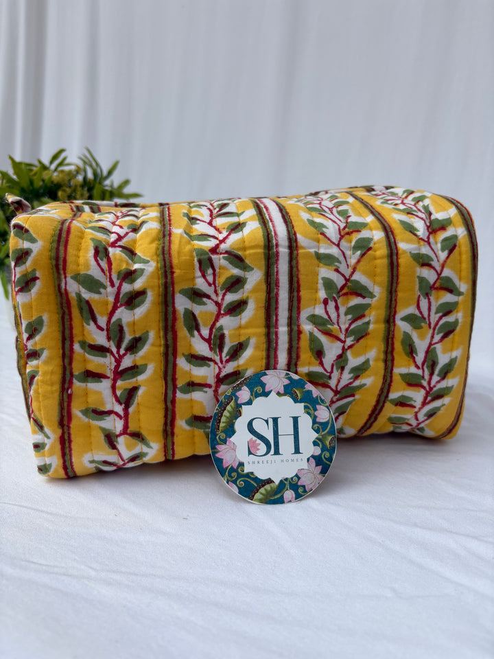 Multi-Utility Travel Pouches Multi-purpose Hand Block Cotton fabric pouches with wooden beaded tassels. These beautiful and spacious pouches have plastic waterproof lining with 2 pockets inside. Can be used for organizing...